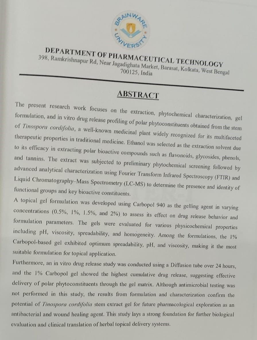 http://111.93.178.142:25000/jspui/handle/123456789/2599| Title: | Extraction, characterization, anti bacterial potential assessment to polar phyto constituents to tinospora cordifolia stem extract gel |
