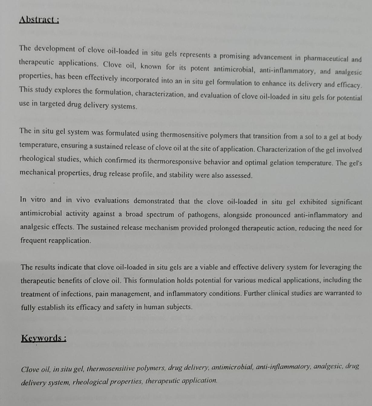 | Keywords: | Clove oil Drug Delivery Rrug delivery system Reheological properties Therapeutic application |