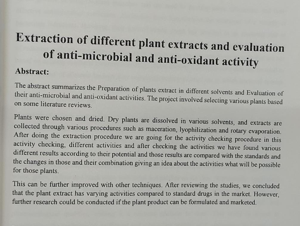 http://111.93.178.142:25000/jspui/handle/123456789/2627| Title: | Extraction of different plant extracts and evaluation of anti microbial and anti oxidant activity |