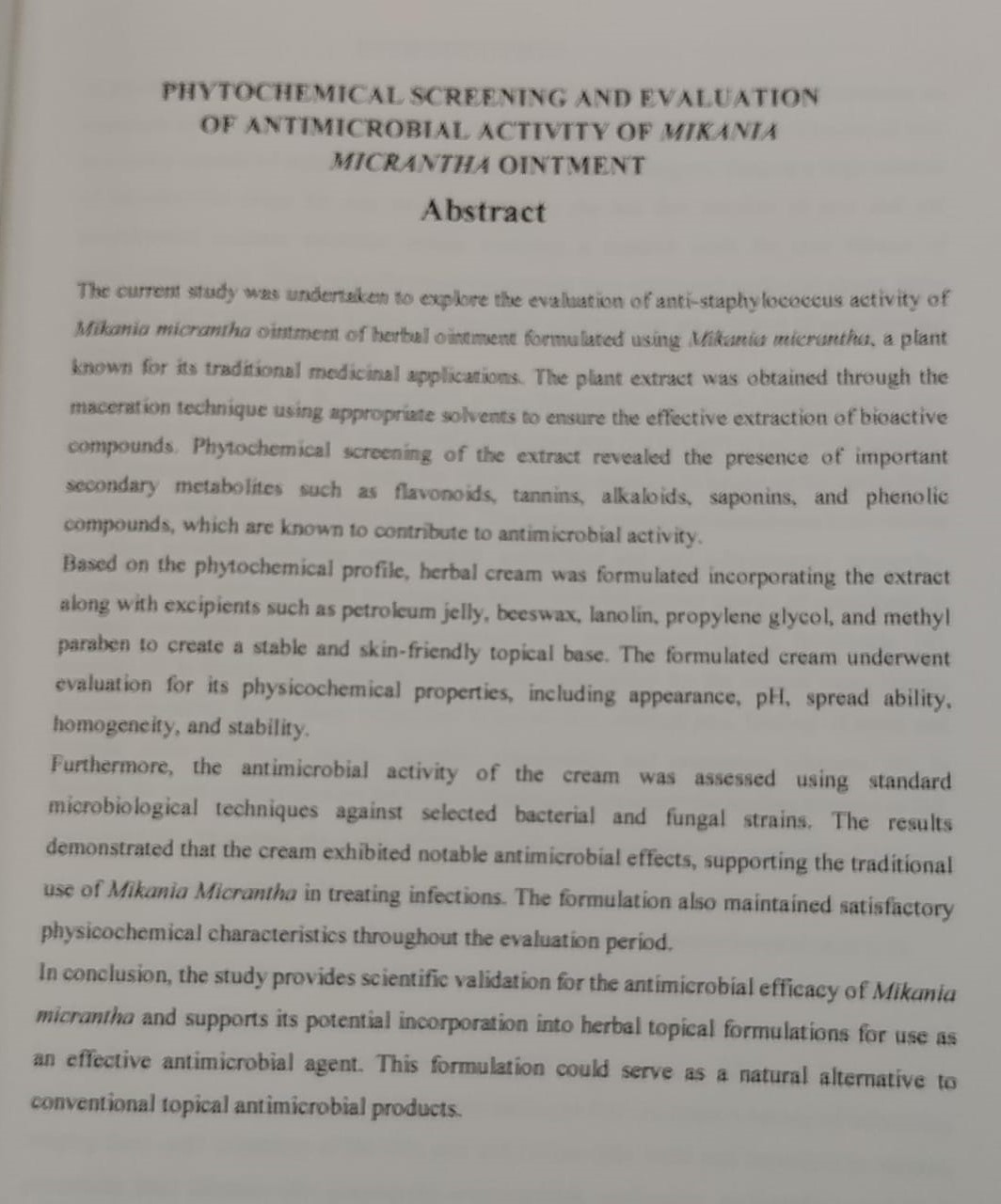 http://111.93.178.142:25000/jspui/handle/123456789/2654| Title: | Phytochemical screening and evaluation of antimicrobal activity of mikania micrantha ointment |